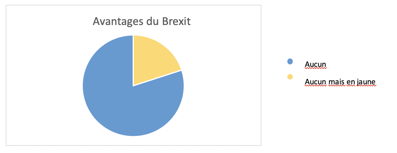Aussi, chapeau à tous ceux qui ont fabriqué une pancarte. Les messages allaient des jugements de valeur sérieux et justes (« Si une démocratie ne peut plus changer d’avis, elle n’est plus une démocratie ») ; aux statistiques simples mais puissantes (« 2016 – 48%, 2019 - ? ») ; aux listes de coûts qui s’imposeraient dans l’absence d’un accord ; aux références à la réticence britannique de protester (« Je suis britannique. Je participe à une manif. Visiblement il y a quelque chose de grave qui se passe. ») ; critiques ciblant divers politiciens, sophistiquées ou inimprimables ; aux phrases courtes qui résumaient parfaitement l’absurdité de la situation (« J’ai fait cette pancarte au lieu d’hurler ») ; aux messages poignants portés par des enfants trop jeunes pour saisir leur importance (« I don’t get a say but I’ll have to pay », comprendre « Mon avis ne compte pas, mais je subirai quand même les conséquences »), « Je renonce à fêter mon anniversaire de trois ans pour être là »), aux jeux de mots jouant sur la similarité entre “EU” et “you” (“I can’t live without EU” , comprendre "Je ne peux pas vivre sans l’UE") ou bien encore des graphiques inspirés d’un éclair de génie :