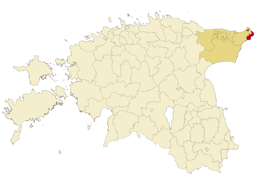 Ein Überblick auf Estland: Dunkelgelb ist die Region Ida-Virumaa gekenntzeichnet, Rot ist das Stadtgebiets Narwas. Foto: Flying Saucer Wikimedia Commons