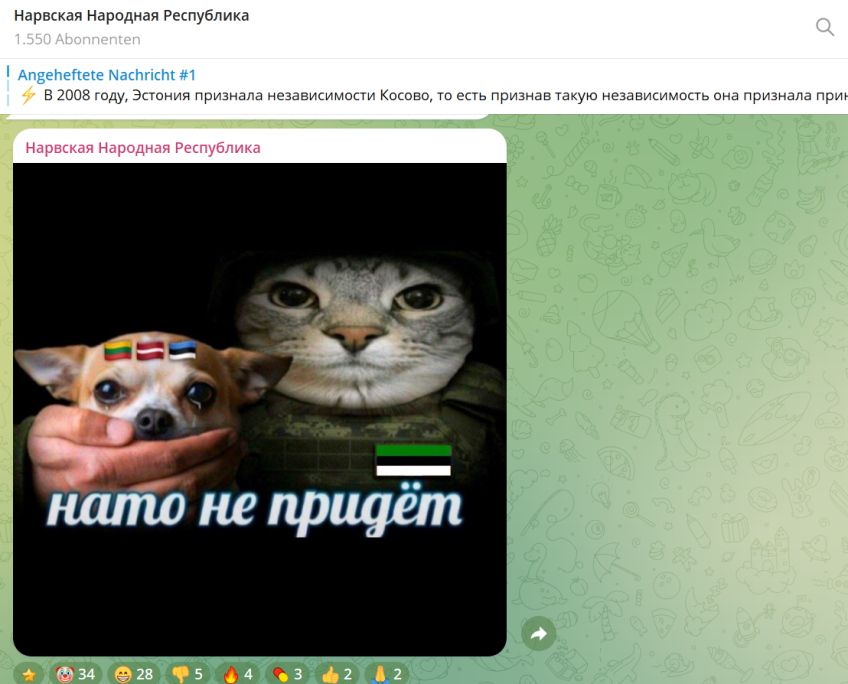 „Volksrepublik Narwa“ (rus.: Нарвская Народная Республика) heißt die am 14. Juli 2025 erstellte Telegram-Gruppe, welche mit ihrem separatistischen Inhalt in Estland für große Diskussionen sorgt. Täglich werden dort politisch motivierte Memes gepostet und die Volksrepublik Narwa ausgerufen – oft eingefärbt in einer grün-schwarz-weißen Flagge. Sie soll wohl an die estnische Trikolore angelehnt sein und löst damit eine Provokation aus, denn die Staatlichkeit ist in Estland heilig.
